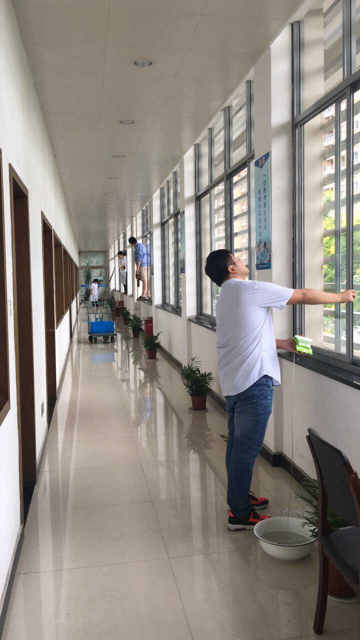 此次活動主要對水質大樓外墻窗戶進行清洗。清洗過程中,大家表現出不怕臟、不怕累的精神,即便最后下起了雨,依然冒雨繼續清洗工作。